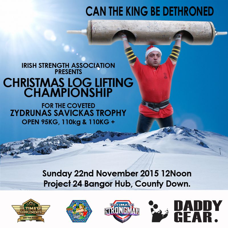 EVENT CHRISTMAS LOG LIFTING CHAMPIONSHIPS 95KG, 110KG & 110KG+ DATE SUNDAY 22ND NOVEMBER 2015 TIME 12 NOON VENUE BANGOR HUB (PROJECT 24), BANGOR COUNTY DOWN LOG FOR MAX 1RM WEIGHT LOG FOR REPS CATEGORY WEIGHT FOR REPS 95kg, 110kg & 110kg + TROPHY WEIGHT CLASS TROPHIES FOR ALL WITH THE OVERALL COVETED ZYDRUNDAS ZAVICKAS TROPHY